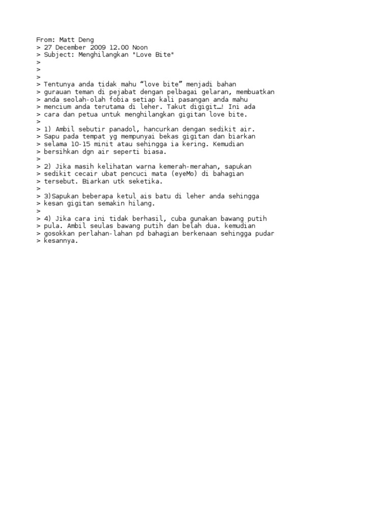 Memohon tumbukan bawang putih tadi ke leher anda dan biarkan beberapa saat maka love bite tadi akan hilang. Bau kaki ini boleh saja disebabkan oleh peluh berlebih di daerah telapak kaki. Akhir sekali kalau anda tak suka kesan love bite tersebut baik anda jangan gatal gatal nak buat lagi.