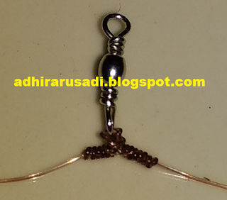 Kita memasang mata kail pada belakang ikan dekat dengan ekor dimana kail di letakkan pada bagian bawah ikan.