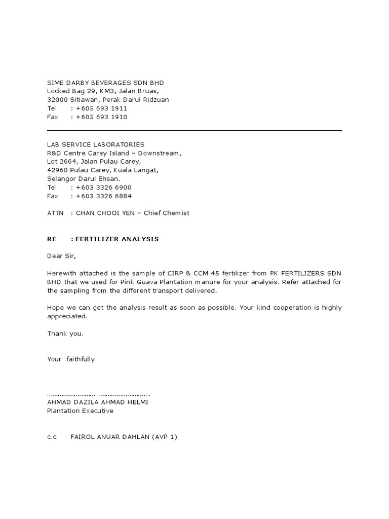 Sime Darby Beverages Sdn Bhd Lab Analysis Ccm Erp Pk Fertilizers
