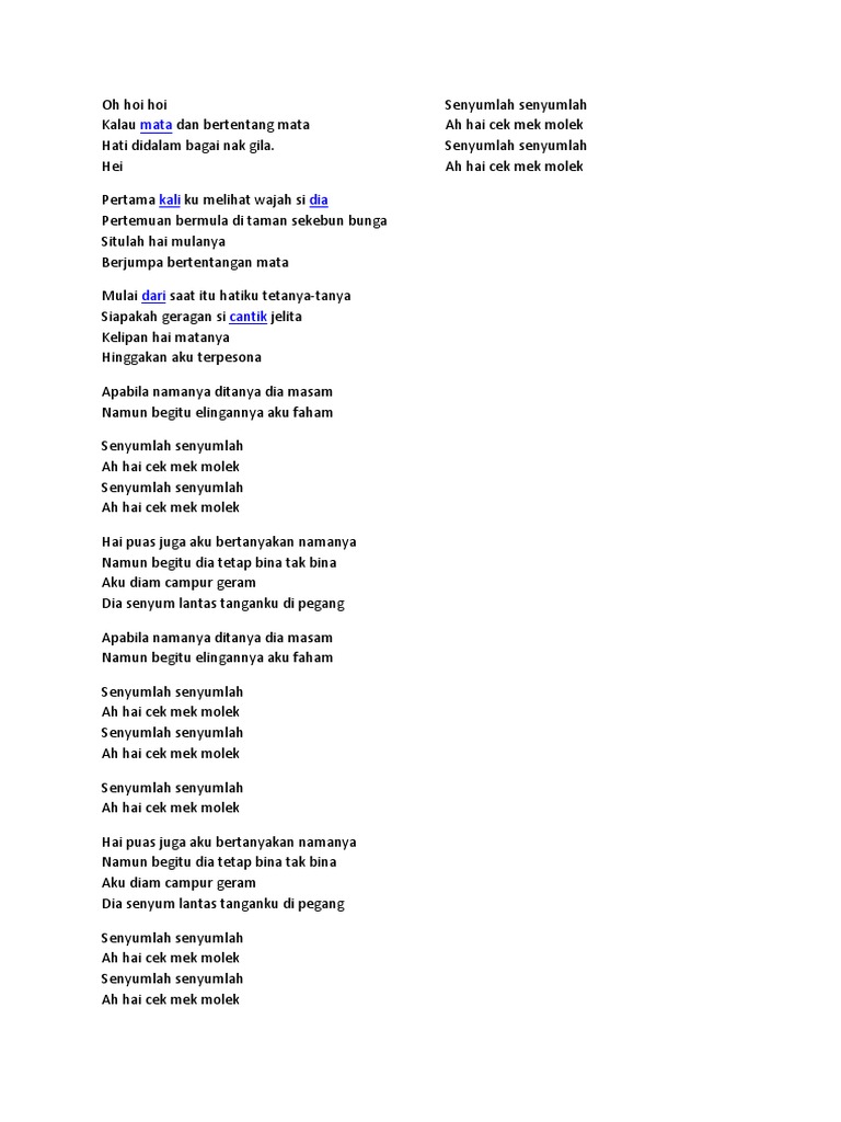 Cek mek molek lirik. Lirik lagu cek mek molek khalifah. Cek mek molek senyumlah senyumlah ah. Pertama kali ku melihat wajah si dia pertemuan bermula di taman sekebun bunga situlah hai mulanya berjumpa bertentangan mata.