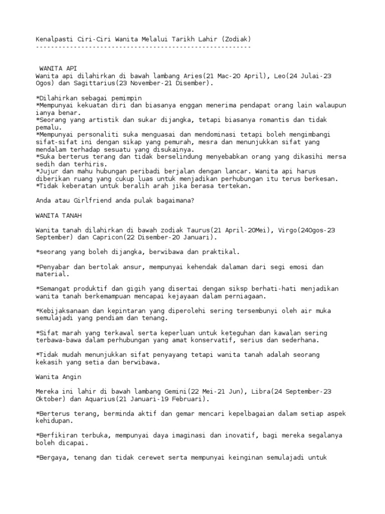 Ti Ciri Ciri Wanita Melalui Tarikh Lahir Zodiak