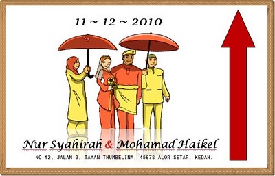 Antara contoh seperti simpang jalan yang tidak mempunyai landmark seperti sekolah surau jambatan dan sebagainya yang jelas dan simpang2 yang berdekatan antara satu sama lain. Makanya pengantin telah menaip nama beliau bakal suami tercinta waktu tu masih bakal sekarang sudah jadi incik asben dgn font size paling besar. Untuk kemudahan tetamu dari selatan dan utara melihat arah rumah pengantin.