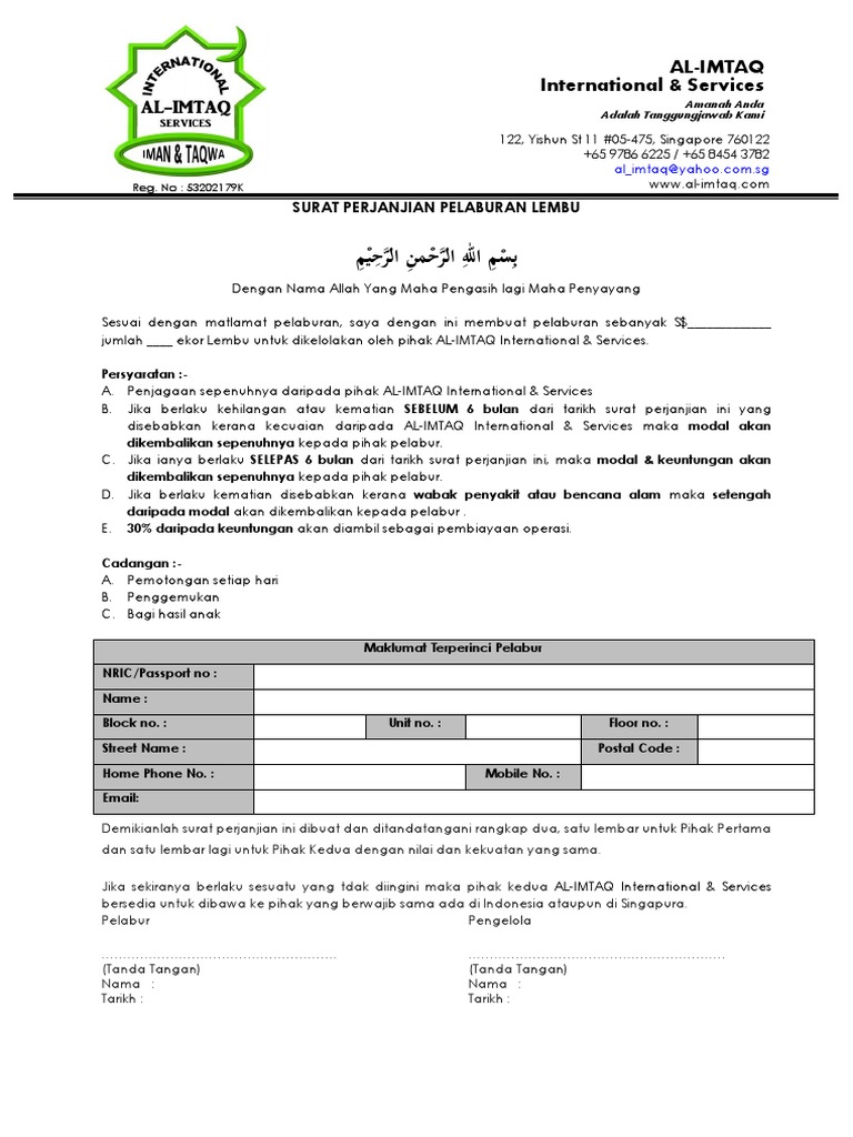 Contoh Surat Perjanjian Pelaburan Modal