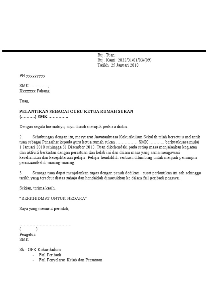 Contoh Surat Perlantikan Jawatan Dalam Persatuan