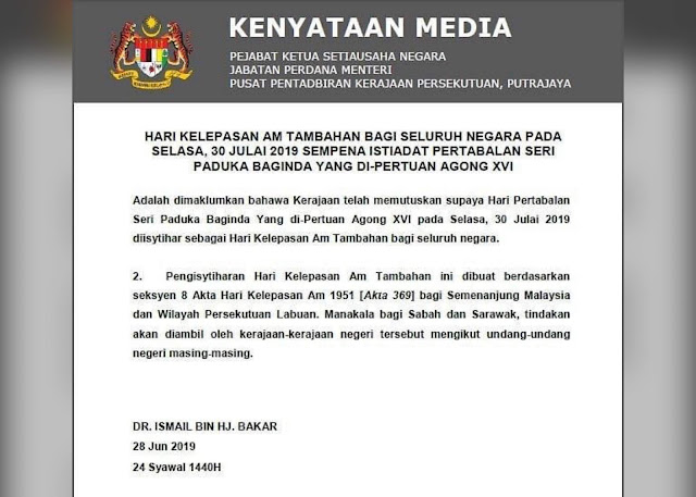 Cuti am pada 30 julai 2019. Bernama ketua setiausaha negara datuk seri dr ismail bakar dalam kenyataan hari ini berkata pengisytiharan hari kelepasan am tambahan itu dibuat berdasarkan seksyen 8 akta hari kelepasan am 1951 akta 369 bagi semenanjung malaysia dan wilayah persekutuan labuan. Kerajaan mengumumkan 30 julai sebagai cuti am tambahan bagi seluruh negara sempena hari pertabalan yang di pertuan agong ke 16 al sultan abdullah ri ayatuddin al mustafa billah shah.