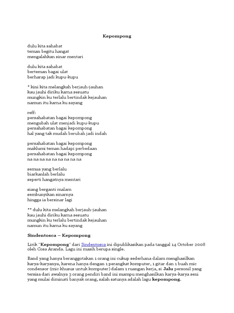 Lirik kepompong dari sindentosca ini dipublikasikan pada tanggal 14 october 2008 12 tahun yang lalu belum ada info detil tentang single ini.