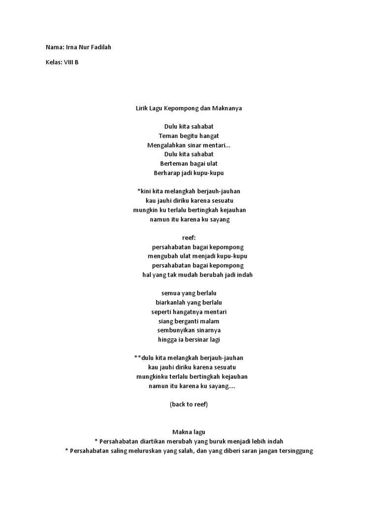 Dari ulat jadi kepompong lirik. Persahabatan bagai kepompong mengubah ulat menjadi kupu kupu persahabatan bagai kepompong hal yang tak mudah berubah jadi indah. A dulu kita sahabat d dengan begitu hangat bm e mengalahkan sinar mentari. Jadilah rama rama yang indah rama rama terbang merata hisap madu di pohon bunga sungguh cantik aneka warna tapi sayang hidup tak lama begitulah hidup manusia pada allah kita berdoa agar jadi insan mulia tapi sayang hidup tak lama.