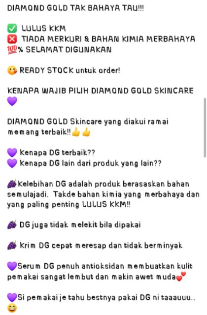 Diamond gold skincare bahaya. Aku tak pernah dengar skincare nama dg. Lebih berseri dan macam ada nur gitu. Skincare dg nightcream diamond gold exclusive set triple serum 5 in 1 and diamond gold dg nightcare 3 in 1 skincare set are topselling products from diamond gold skincare malaysia that you can find on iprice.