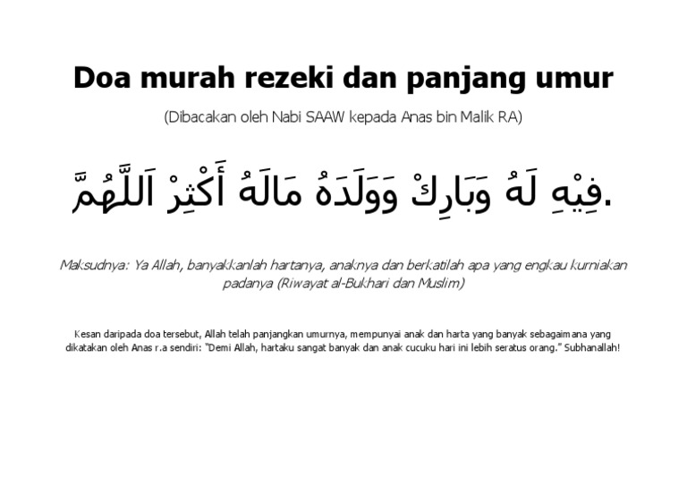 Ya allah perbanyakanlah hartaku dan anak anak anakku dan luaskanlah rumahku dan berkatilah apa yg telah engkau kurniakan kepadaku dan perbaikilah amalanku dan ampunkan untukku. Ke madinah ketika anas masih berumur 10 tahun. Bolehkan ustaz huraikan kisah sahabat rasulullah saw yang bernama anas bin malik dan doa nabi saw kepada beliau iaitu doa untuk murah rezeki dan panjang umur.